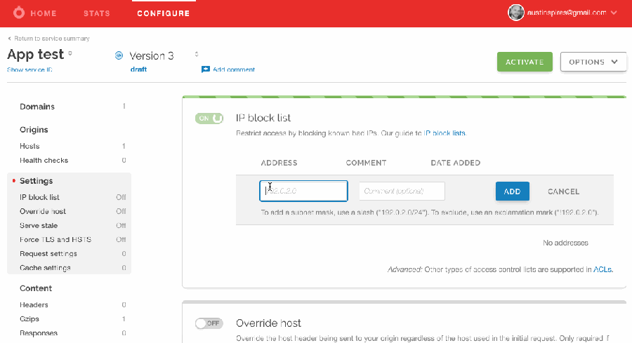 Quick config: Quick configs are a reusable design pattern, exposing key features of Fastly’s platform in a one-click format that makes it easy for customers to use. Our Design team has been optimizing the use of quick configs to balance the flexibility and customizability of our platform with the need for something simple and easy-to-use.