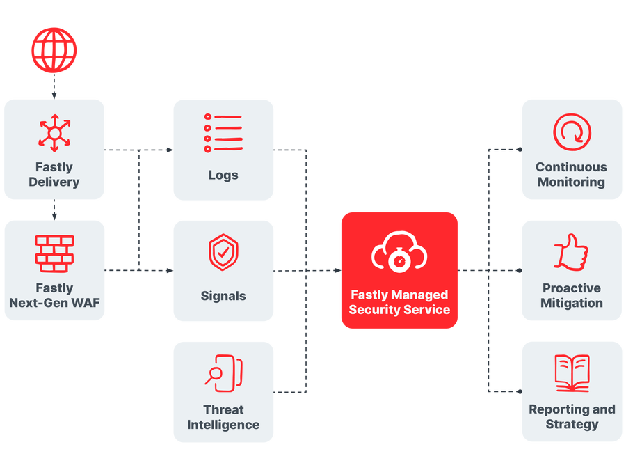 Fastly マネージドセキュリティサービスは、Fastly の既存のプロフェッショナル・マネージメント・サービスとセキュリティモニタリングサービスを基に構成されており、高度な脅威に幅広く対応し、積極的なコラボレーションも促進します。