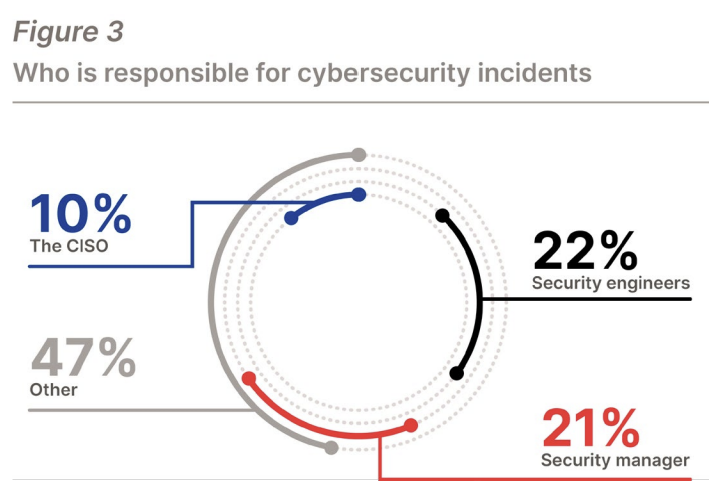 A major problem stems from an unclear distribution of cybersecurity incident responsibility among different parties. The organization lacks an explicit cybersecurity leader because multiple staff members at various levels demonstrate minor accountability responsibilities. According to the survey results, the CISO ranks third in accountability (10%), with security engineers taking first place (22%). Security managers come in second at 21%.