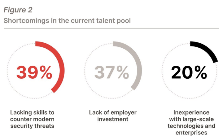• The market is not providing the talent that companies need. There are also signs of an inability to scale cybersecurity efforts as capacity and complexity demands increase. Traditionally, companies have invested in more talent to try to keep up with burgeoning cybersecurity needs, but this year sees a deep dissatisfaction with the available talent pool. That calls for a rethinking of skills management practices to cope with evolving cybersecurity needs