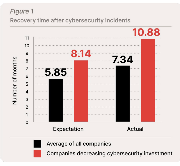 So why the large delta? One answer is undoubtedly that recovery times rise as cybersecurity investment falls. We saw a direct correlation between those companies that expect to spend less in the next 12 months and those expecting recovery time exceeding eight months. The gap between perception and reality continues to grow - companies planning to reduce cybersecurity investments take nearly 11 months to recover from incidents, about a third longer than they anticipate. In contrast, organizations that maintain or increase their cybersecurity spending recover significantly faster