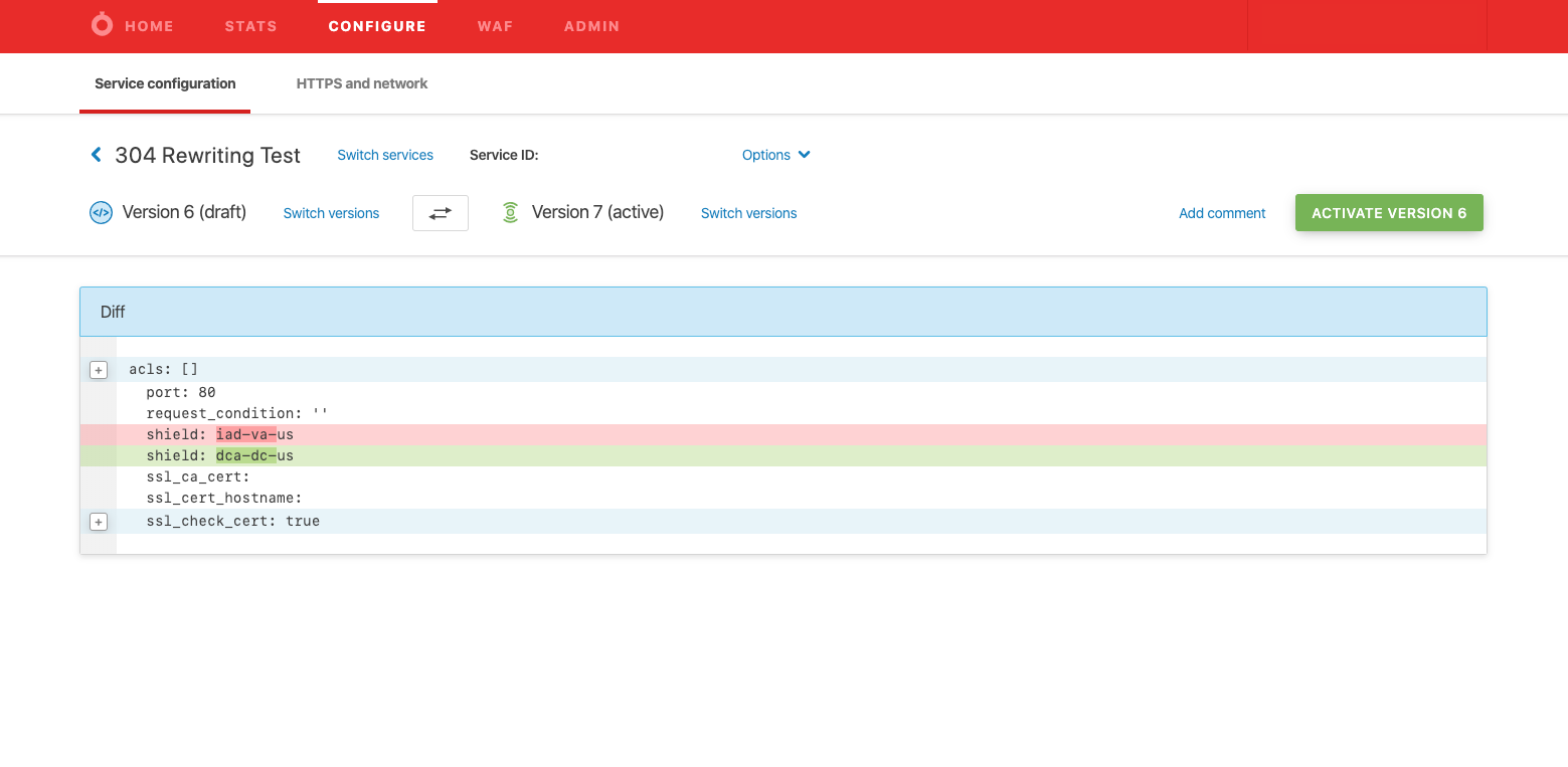 VCL Diff: We improved the VCL Diff experience by collapsing unaltered code and only highlighting the changes, making them easier to identify and eliminating the need to scroll through the full text. We also improved the Diff header experience, allowing users to easily activate old versions.